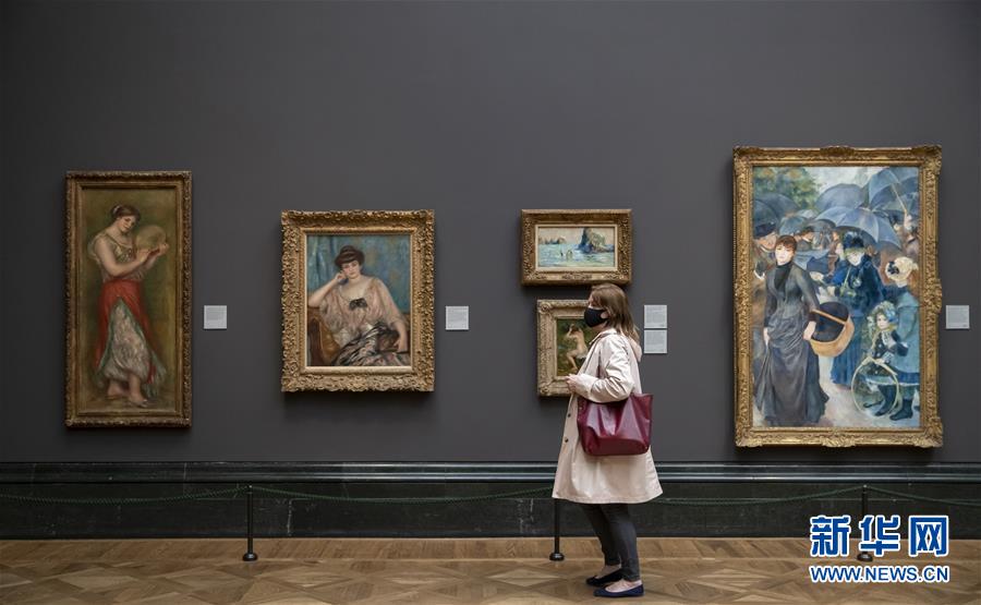 7月4日,參觀者佩戴口罩在英國國家美術館的媒體開放日上參觀。新華社記者韓巖攝
