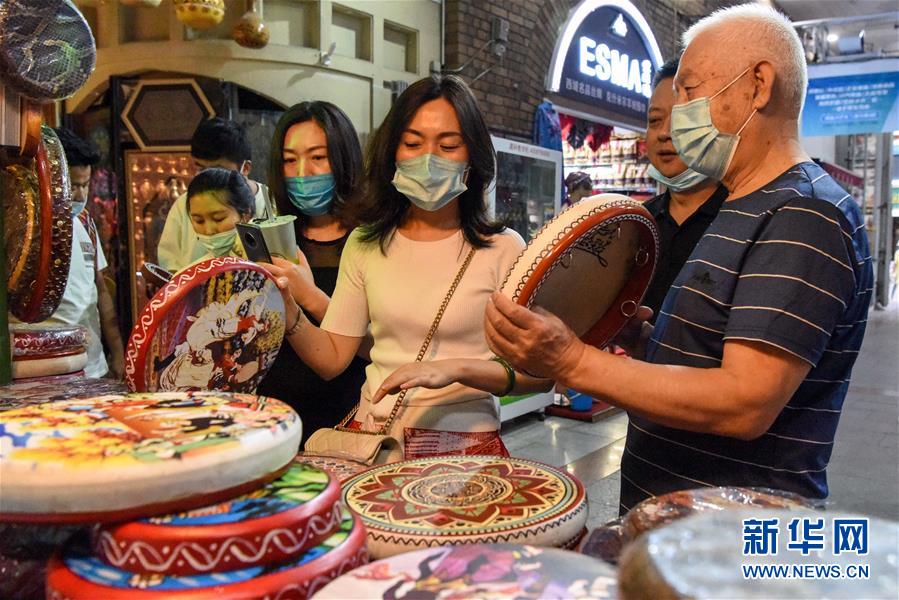 游客在烏魯木齊大巴扎景區(qū)購買手鼓(7月4日攝)。夏日周末,烏魯木齊市大巴扎景區(qū)內熙熙攘攘,人們來到這里品嘗美食、休閑購物。2018年,經過靚化改造后的大巴扎景區(qū)新增長約800米的步行街,分為文創(chuàng)文旅和“非遺”項目街區(qū)、國際時尚街區(qū)和大巴扎美食街區(qū),是烏魯木齊最受歡迎的旅游目的地之一。新華社記者丁磊攝