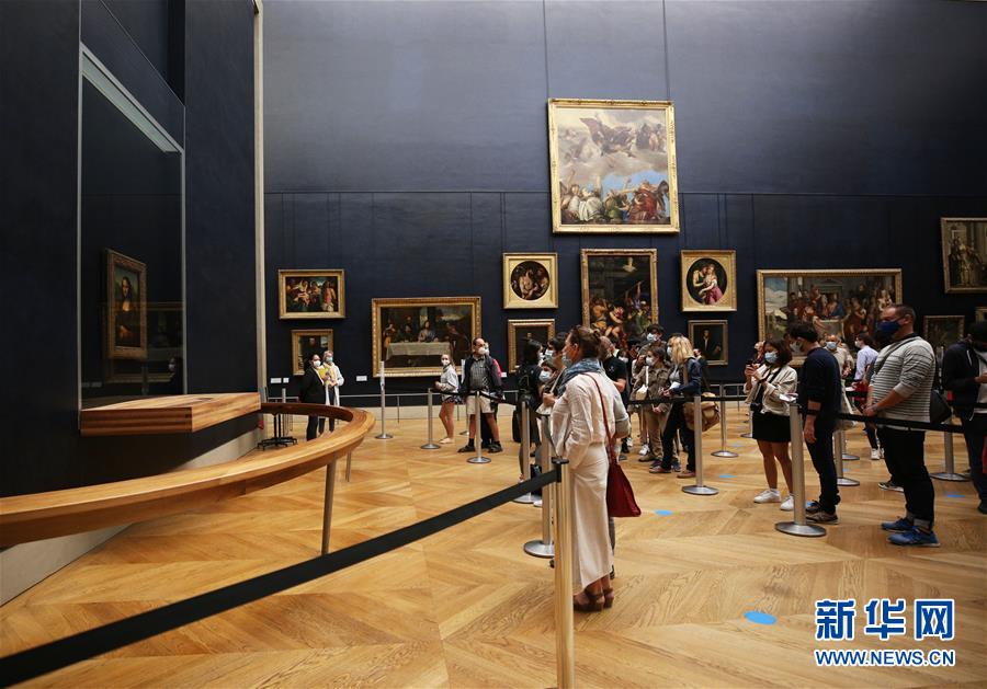 7月6日,參觀者在法國(guó)巴黎盧浮宮博物館欣賞萊昂納多·達(dá)·芬奇的名作《蒙娜麗莎》。因新冠病毒疫情關(guān)閉3個(gè)多月后,法國(guó)盧浮宮博物館于6日重新開放。新華社記者高靜攝