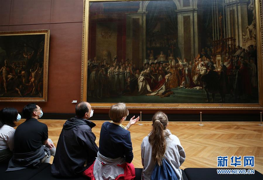 7月6日,參觀者在法國(guó)巴黎盧浮宮博物館欣賞畫作《拿破侖加冕》。因新冠病毒疫情關(guān)閉3個(gè)多月后,法國(guó)盧浮宮博物館于6日重新開放。新華社記者高靜攝