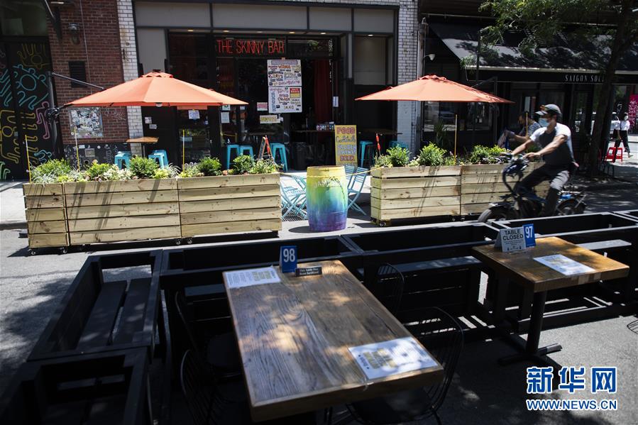 7月6日,一名男子騎車從美國紐約一家餐廳的戶外餐區(qū)旁經(jīng)過。當(dāng)天,紐約進入重啟第三階段,美甲店、按摩店等個人護理業(yè)在經(jīng)歷近4個月的停業(yè)后被允許重新開放。因防疫需要,原本應(yīng)在第三階段開放的餐飲業(yè)室內(nèi)就餐仍處于暫停狀態(tài)。新華社記者王迎攝