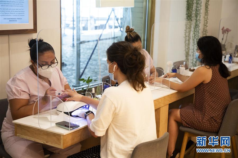 7月6日,技師在美國紐約一家美甲店為顧客美甲。當天,紐約進入重啟第三階段,美甲店、按摩店等個人護理業(yè)在經(jīng)歷近4個月的停業(yè)后被允許重新開放。因防疫需要,原本應(yīng)在第三階段開放的餐飲業(yè)室內(nèi)就餐仍處于暫停狀態(tài)。新華社記者王迎攝