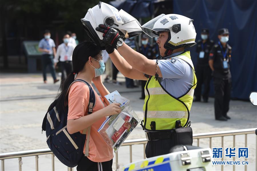 7月7日,在安徽省合肥市五十中學(xué)天鵝湖校區(qū)考點(diǎn),交警將快要遲到的考生送到考場。當(dāng)日,2020年高考拉開帷幕。新華社記者周牧攝