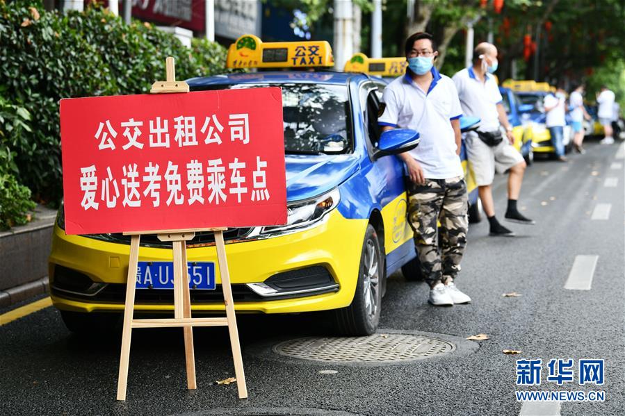 7月7日,在貴州省貴陽市第六中學考點外,愛心送考出租車司機在等候考生結(jié)束考試后免費乘車。當日,2020年高考拉開帷幕。新華社記者楊文斌攝