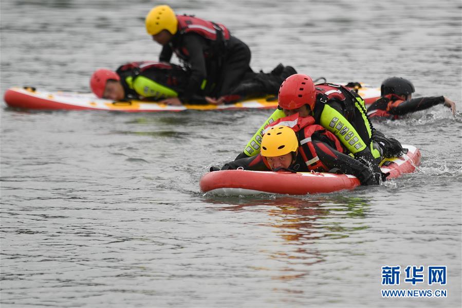 7月7日,吳興區(qū)消防救援大隊隊員在演練水上救援,以備搶險。近日,位于浙江北部的湖州市遭遇多輪降雨,東部平原河網(wǎng)普遍超警戒水位,水庫山塘高位運行。7月5日12時30分,湖州市人民政府防汛防旱指揮部將防汛應急響應提升至Ⅲ級,要求各地密切監(jiān)測汛情,切實做好各項防范工作,確保安全度汛。新華社記者黃宗治攝