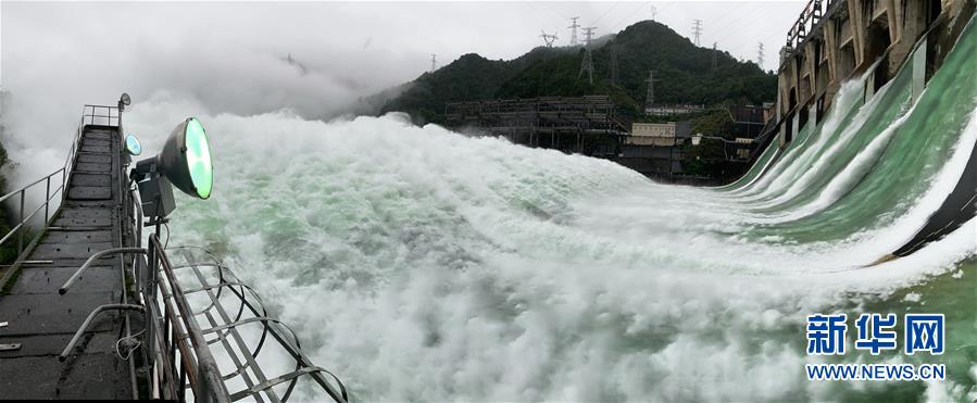 7月7日下午開啟7孔泄洪的新安江水庫(手機全景模式拍攝)。受持續(xù)降水影響,浙江新安江水庫水位持續(xù)快速上升。繼當日10時開啟3孔、12時開啟5孔泄洪后,新安江水庫于16時增加到7孔泄洪。新安江水庫是華東地區(qū)最大的水庫,在錢塘江流域的防洪度汛中起到關鍵作用。新華社記者翁忻旸攝