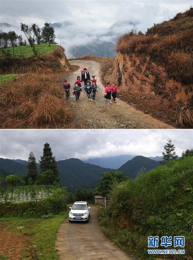 這是一張拼版照片,上圖:在廣西龍勝龍脊鎮(zhèn)江柳村,余啟貴老師背著背簍領(lǐng)著學(xué)生去學(xué)校(2013年2月26日攝);下圖:在廣西龍勝龍脊鎮(zhèn)江柳村,余啟貴老師開(kāi)著自己的汽車(chē)帶著學(xué)生去學(xué)校(7月7日攝)。新華社記者陸波岸攝