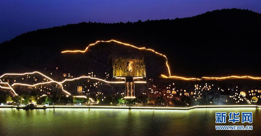 7月7日拍攝的洛陽龍門石窟景區(qū)夜景(無人機(jī)照片)。近日,河南洛陽的夜晚愈發(fā)繽紛多彩。立足于厚重的隋唐文化底蘊(yùn),洛陽正通過創(chuàng)新夜游產(chǎn)品打響“古都夜八點(diǎn)”品牌,激活文旅消費(fèi)。新華社記者李安攝