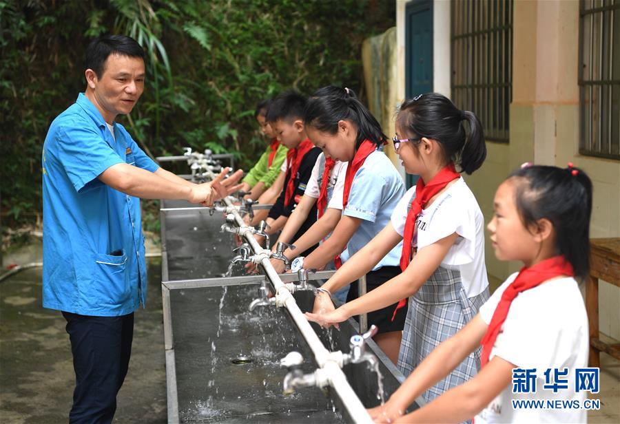 7月8日,陶雷為長垌小學(xué)的學(xué)生講解科學(xué)洗手的方法。新華社記者周華攝