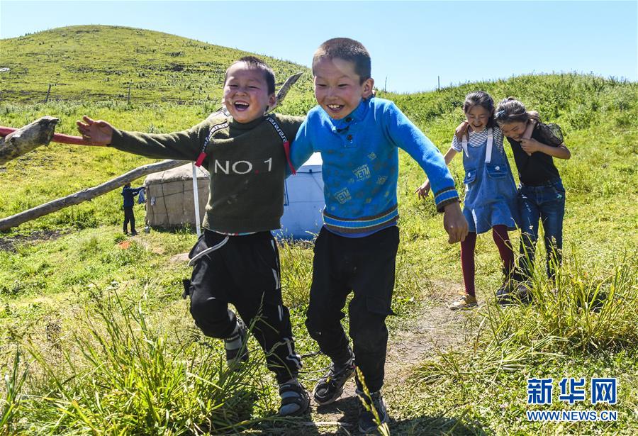 在新疆特克斯縣境內(nèi)的夏牧場里,小朋友在玩耍(7月2日攝)。新華社記者王菲攝
