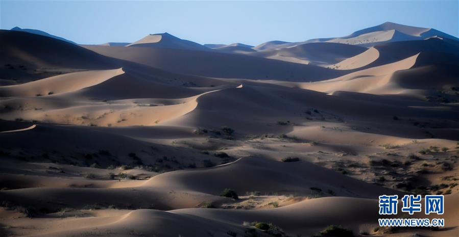 這是7月8日拍攝的騰格里沙漠風(fēng)光。位于內(nèi)蒙古自治區(qū)阿拉善左旗西南部和甘肅省中部邊境的騰格里沙漠是我國第四大沙漠,總面積約為4.3萬平方公里。夏日傍晚,騰格里沙漠連綿的沙丘被日光勾勒出美麗的線條,美不勝收。新華社記者連振攝