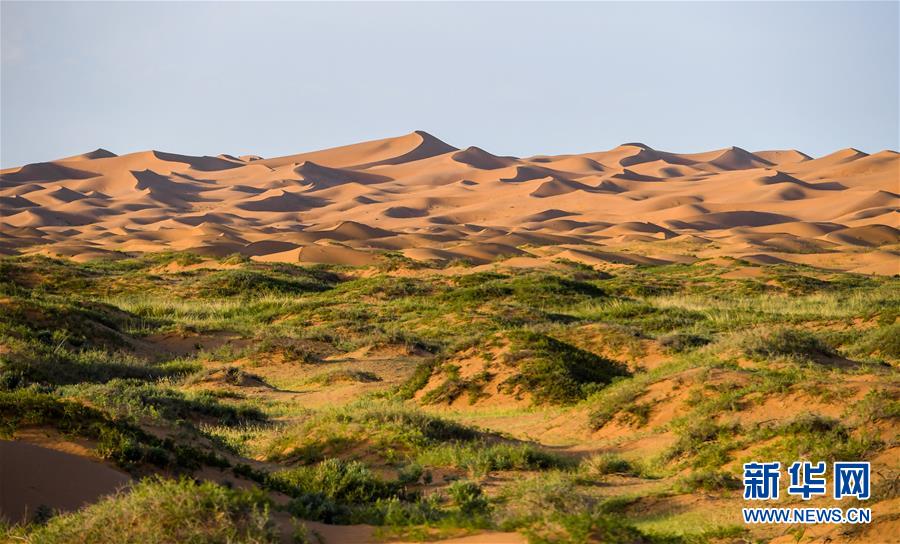 這是7月8日拍攝的騰格里沙漠風(fēng)光。位于內(nèi)蒙古自治區(qū)阿拉善左旗西南部和甘肅省中部邊境的騰格里沙漠是我國第四大沙漠,總面積約為4.3萬平方公里。夏日傍晚,騰格里沙漠連綿的沙丘被日光勾勒出美麗的線條,美不勝收。新華社記者連振攝