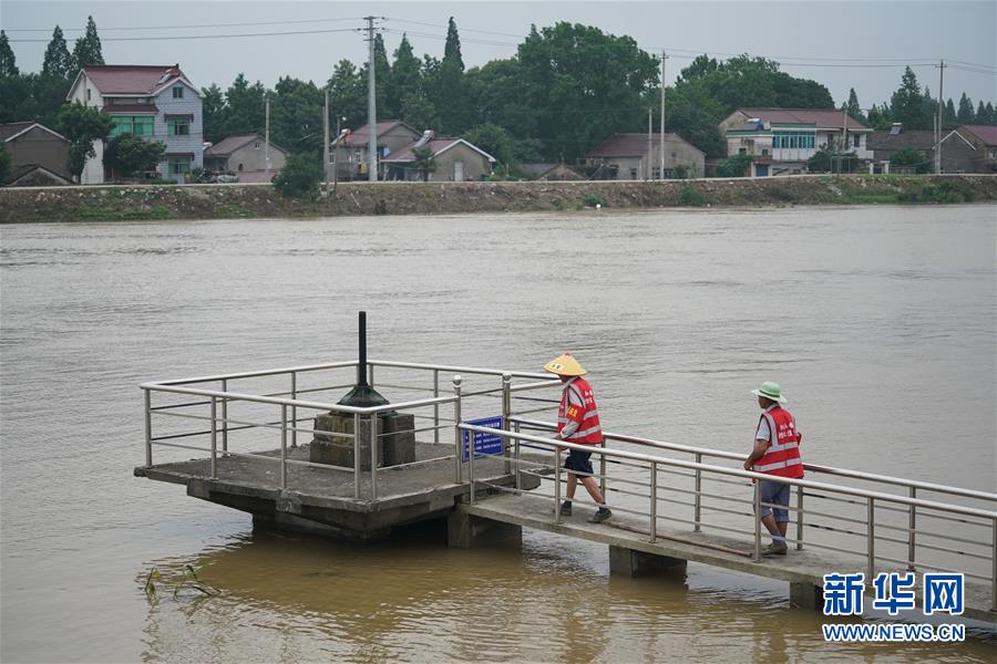 7月9日,在高淳區(qū)陽(yáng)江鎮(zhèn)永豐圩,巡堤員在進(jìn)行“水牌”(巡堤查險(xiǎn)責(zé)任牌)交接。新華社記者季春鵬攝