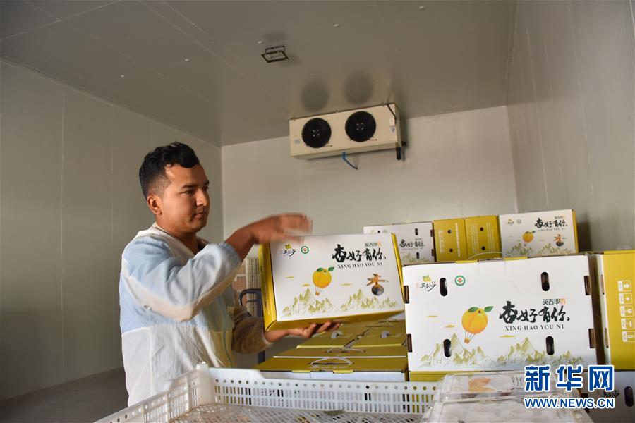 在新疆英吉沙縣一家合作社內(nèi),員工將包裝好的杏子放入冷庫(kù)(7月3日攝)。新華社記者高晗攝