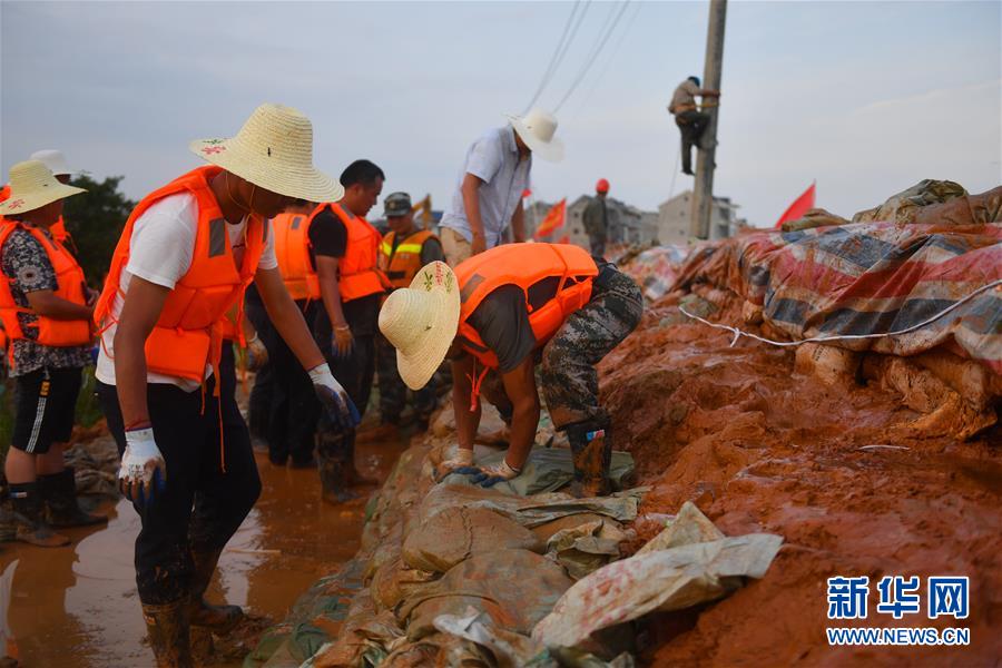 在江西鄱陽縣昌江圩,武警江西總隊(duì)機(jī)動(dòng)支隊(duì)的工作人員和當(dāng)?shù)卮迕褚黄鹂干炒庸疼椎蹋?月12日攝)。新華社記者 胡晨歡 攝