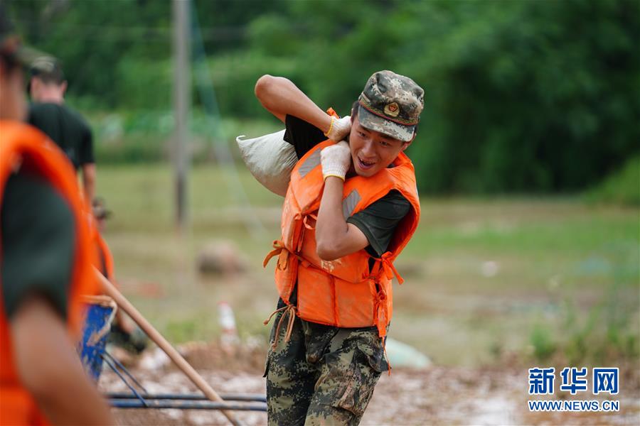 武警戰(zhàn)士在江西省鄱陽縣鄱陽鎮(zhèn)江家?guī)X村搬運(yùn)沙袋(7月11日攝)。新華社記者 周密 攝