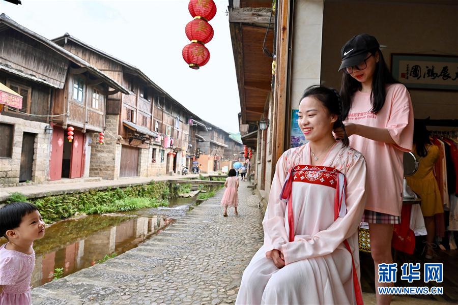 7月4日,游客蘇夢(mèng)(右二)在浦源村一家漢服租賃店體驗(yàn)漢服文化,她的女兒在一旁好奇地觀看。新華社記者 姜克紅 攝