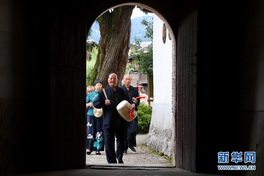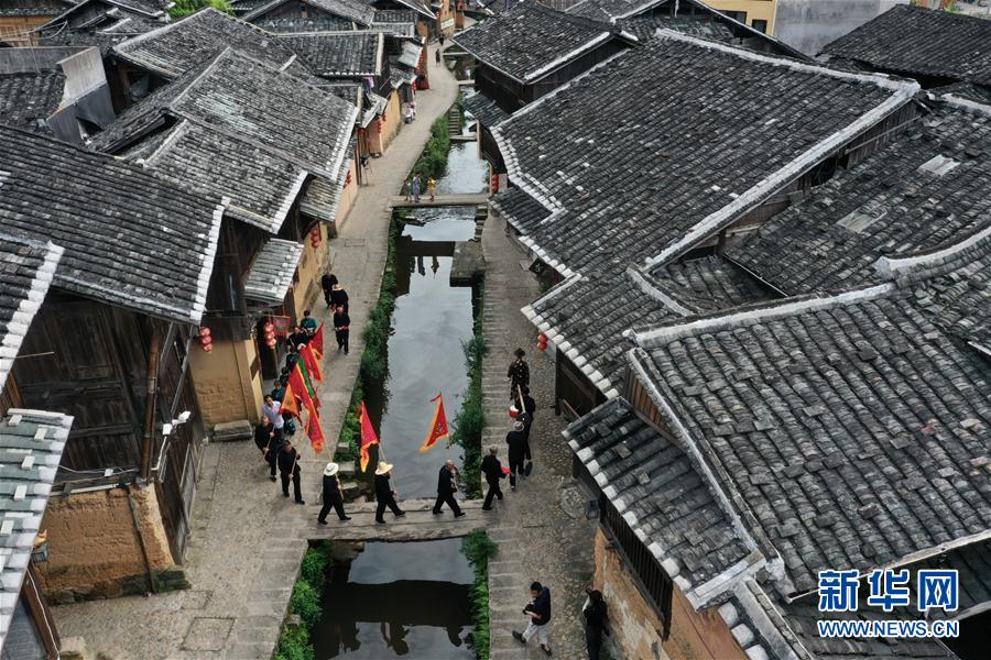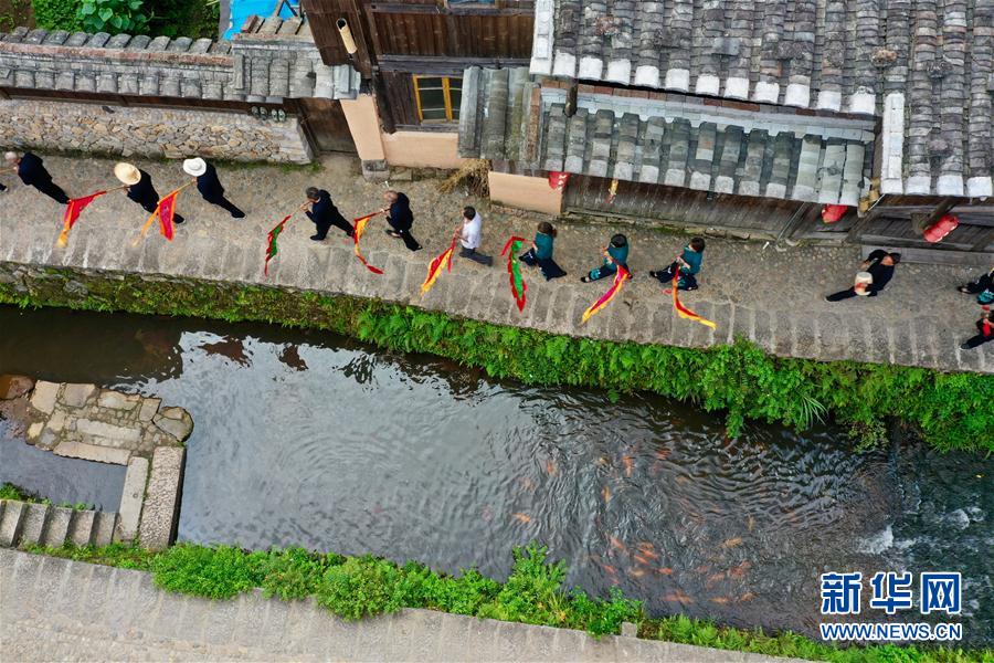7月4日,浦源村民展示魚(yú)祭習(xí)俗(無(wú)人機(jī)照片)。魚(yú)祭習(xí)俗是為死去的鯉魚(yú)舉行送葬儀式,是浦源村特有的習(xí)俗。新華社記者 姜克紅 攝