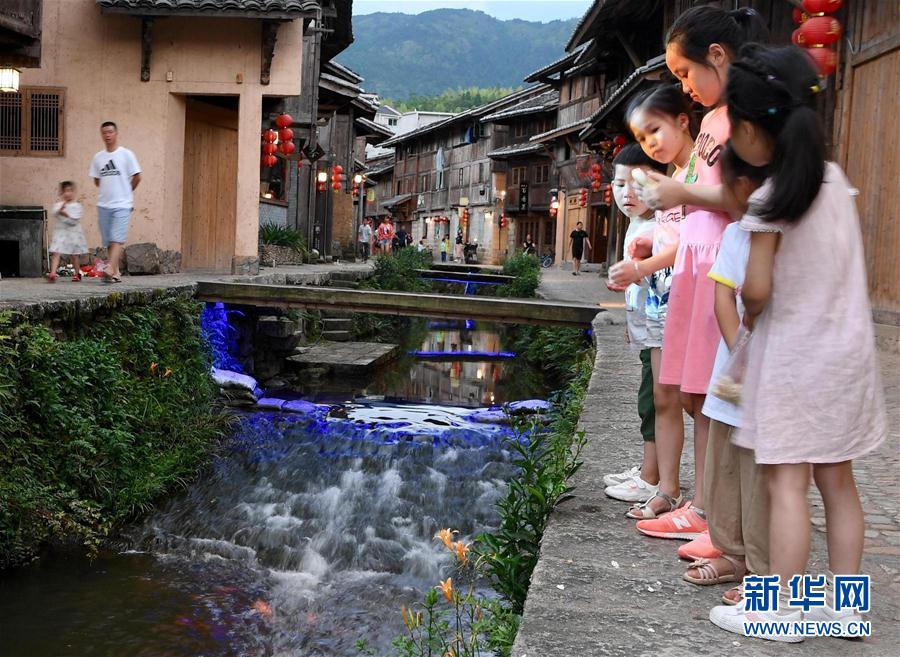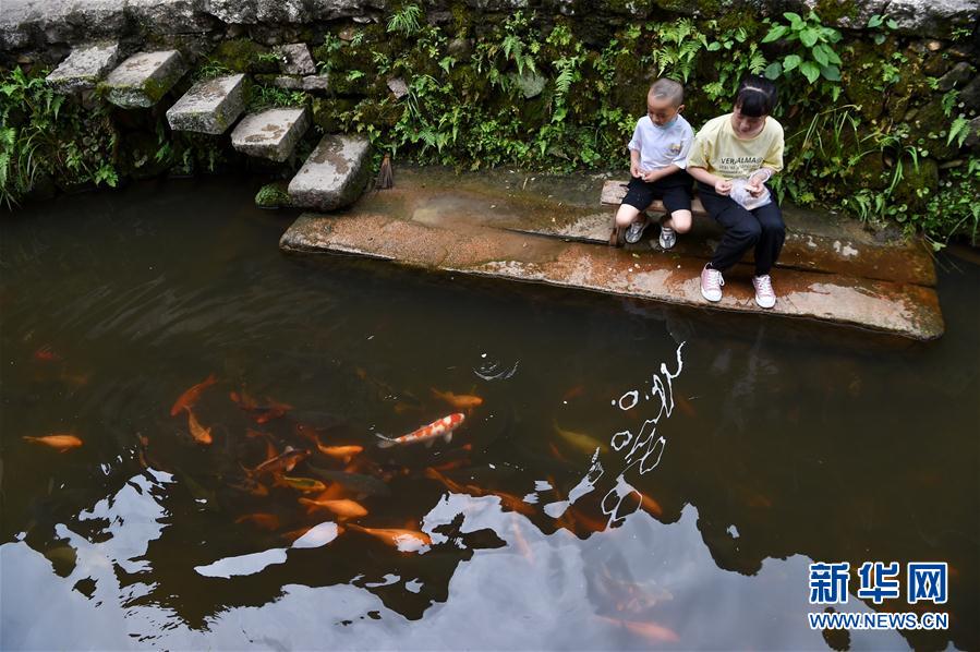 7月3日,小朋友在浦源村鯉魚(yú)溪畔喂食溪中的鯉魚(yú)。新華社記者 姜克紅 攝