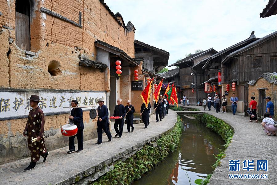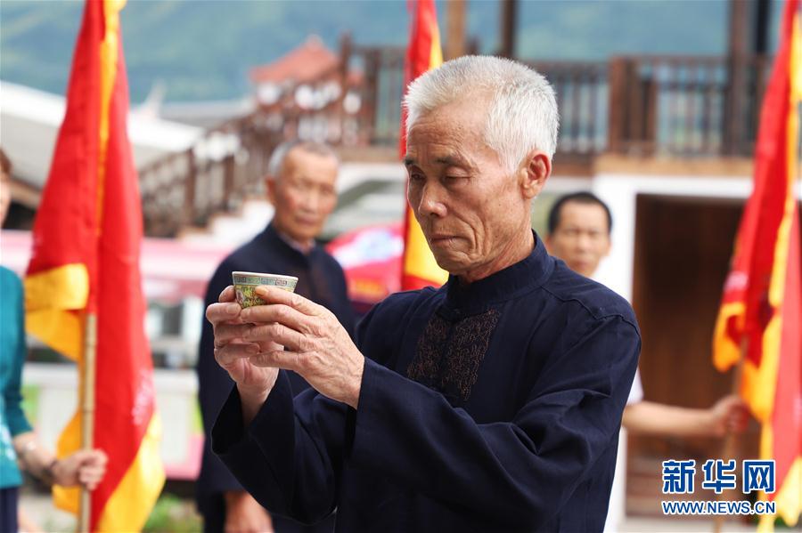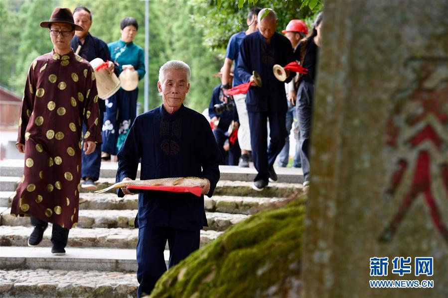 7月4日,浦源村民展示魚(yú)祭習(xí)俗。魚(yú)祭習(xí)俗是為死去的鯉魚(yú)舉行送葬儀式,是浦源村特有的習(xí)俗。新華社記者 姜克紅 攝