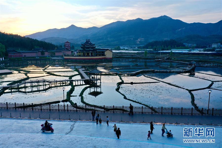 4月17日傍晚時(shí)分,人們?cè)谄衷创艴庺~(yú)溪公園散步休閑(無(wú)人機(jī)照片)。新華社記者 姜克紅 攝