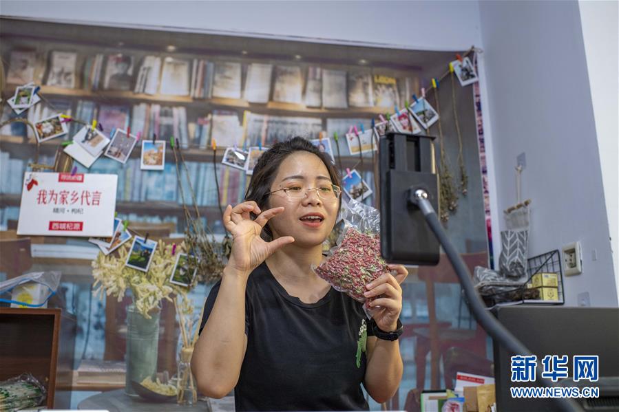 在位于新疆精河縣城的工作室內(nèi),朱虹美通過手機向網(wǎng)友介紹真空包裝的枸杞產(chǎn)品(7月11日攝)。新華社記者 胡虎虎 攝