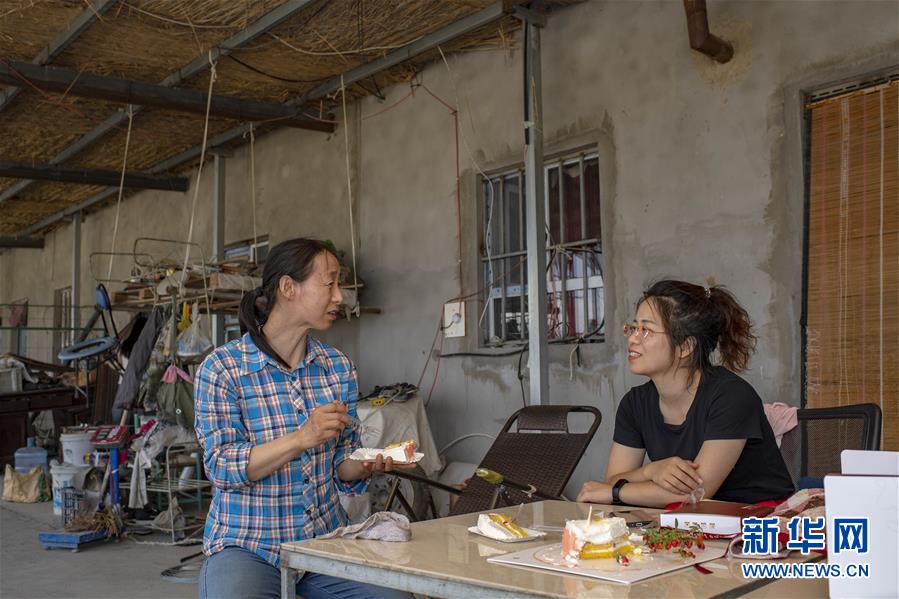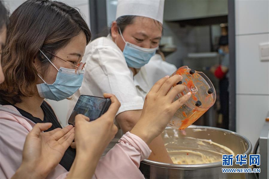 在位于新疆精河縣城的一家糕點店,朱虹美團隊在錄制視頻,介紹創(chuàng)意食品——由枸杞果醬、鮮枸杞制作的“枸杞蛋糕”(7月11日攝)。新華社記者 胡虎虎 攝