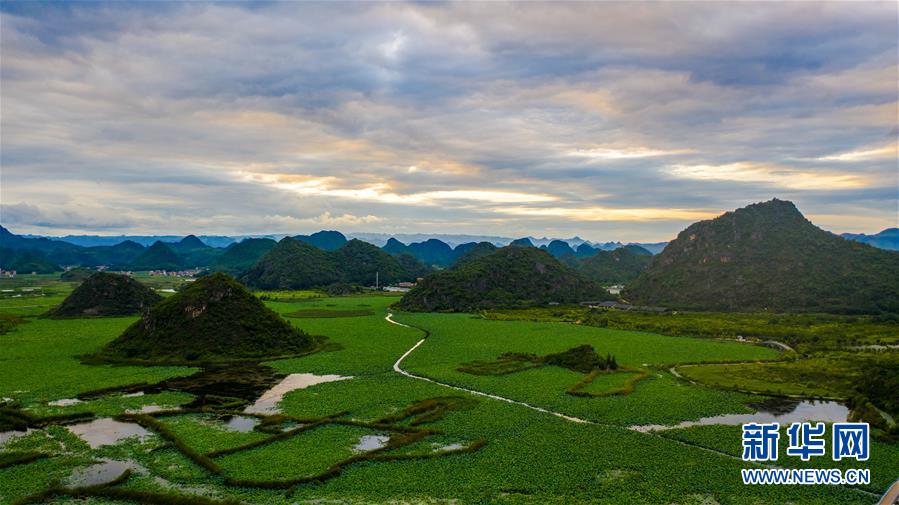 這是7月8日拍攝的普者黑國(guó)家濕地公園的夕陽景觀(無人機(jī)照片)。