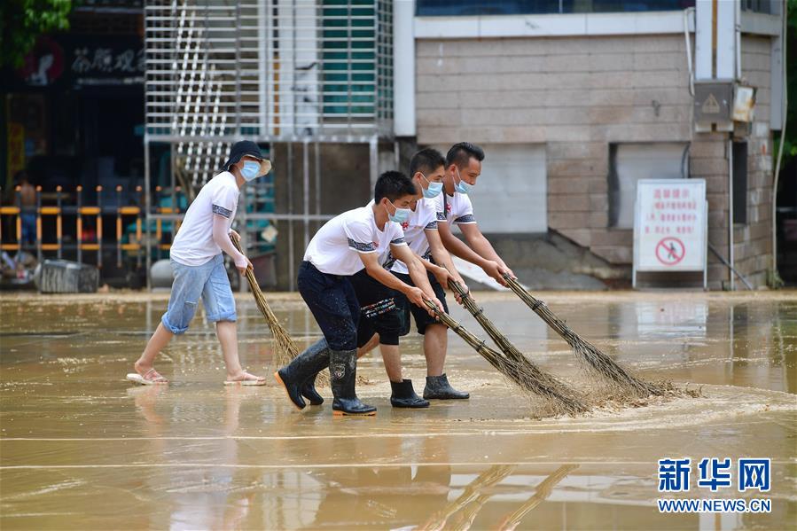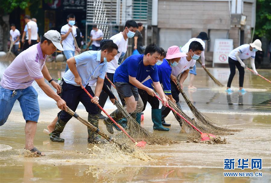 7月12日,融水苗族自治縣文化體育廣電和旅游局清淤小分隊在蘆笙廣場清理地面。當日,在廣西柳州市融水苗族自治縣,融江洪水退去,當?shù)叵嚓P(guān)部門組織多支清淤排險小分隊,積極開展災后恢復工作。新華社記者 黃孝邦 攝