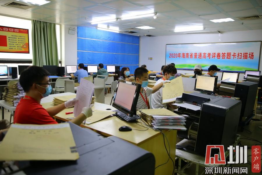 2020年7月13日,在海南師范大學高考評卷場,工作人員仔細拆封考卷并進行掃描入電腦,整個過程井然有序。在評卷現(xiàn)場的入口,除了有武警把守之外,所有工作人員進入到評卷場均有專人使用手柄式金屬探測器對其進行安檢,并通過身份證識別系統(tǒng)中進行身份識別,方可以進入??忌痤}卡由武警24小時值守,并實行嚴密的視頻監(jiān)控。