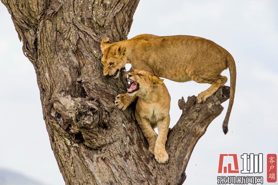 2020年7月13日?qǐng)?bào)道(具體拍攝時(shí)間不詳),Sandesh Kadur是一名印度野生動(dòng)物攝影師,他在坦桑尼亞塞倫蓋蒂國家公園拍攝到一系列“獅子上樹”的精彩照片。畫面中,有一只憤怒的母獅為了捍衛(wèi)自己在樹上的位置,一邊劈叉一邊對(duì)著鏡頭咆哮,有兩只獅子為了爭(zhēng)奪位置互相攻擊,還有一只獅子在找到舒適的位置后呼呼大睡。