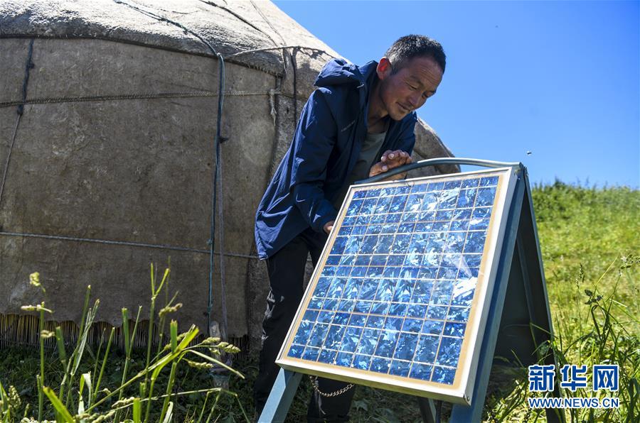 在新疆伊犁特克斯縣境內(nèi)的夏牧場里,一位牧民在氈房外調(diào)整太陽能板的擺放位置(7月2日攝)。新華社記者 王菲 攝
