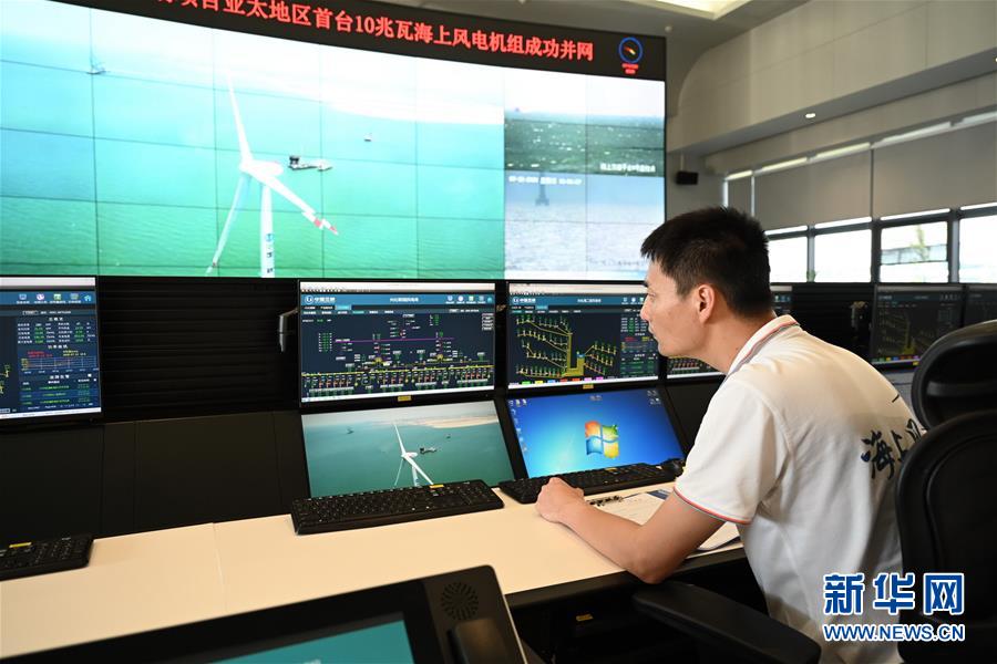 7月12日,三峽福建海上風(fēng)電集控中心工作人員在調(diào)試首臺10兆瓦海上風(fēng)電機(jī)組。記者7月13日從三峽集團(tuán)了解到,國內(nèi)首臺10兆瓦海上風(fēng)電機(jī)組日前在三峽集團(tuán)福建福清興化灣二期海上風(fēng)電場成功并網(wǎng)發(fā)電,這是目前我國自主研發(fā)的單機(jī)容量亞太地區(qū)最大、全球第二大的海上風(fēng)電機(jī)組,刷新了我國海上風(fēng)電單機(jī)容量新紀(jì)錄。新華社記者 林善傳 攝