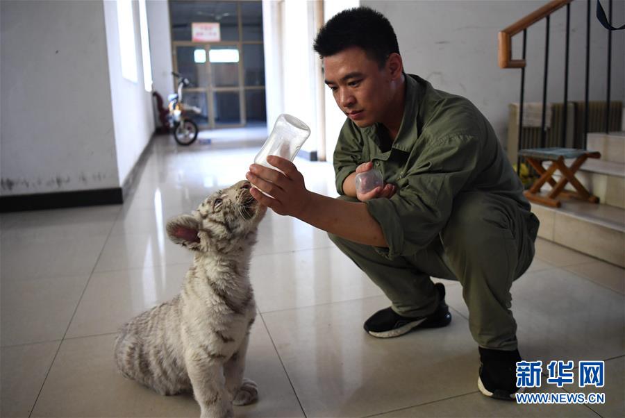 7月13日,動物園工作人員許家興給“妞妞”喂水。河北石家莊市動物園的孟加拉白虎寶寶“妞妞”只有3個月大,由于虎媽媽經(jīng)驗不足,“妞妞”一出生便由動物園工作人員按科學(xué)方法人工飼養(yǎng)。目前,在飼養(yǎng)員的精心照料下,“妞妞”正在茁壯成長。新華社記者 王曉 攝
