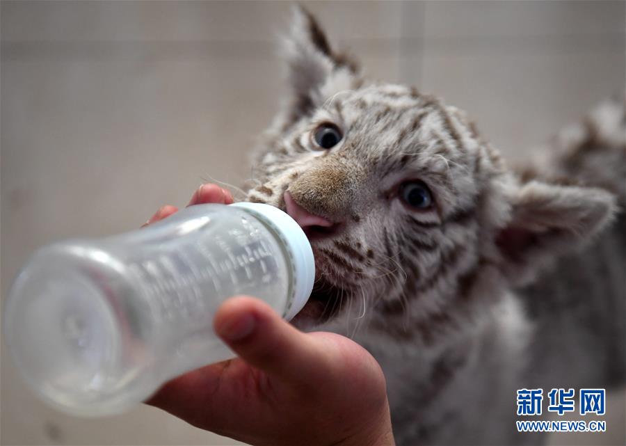 7月13日,工作人員給“妞妞”喂水。河北石家莊市動物園的孟加拉白虎寶寶“妞妞”只有3個月大,由于虎媽媽經(jīng)驗不足,“妞妞”一出生便由動物園工作人員按科學(xué)方法人工飼養(yǎng)。目前,在飼養(yǎng)員的精心照料下,“妞妞”正在茁壯成長。新華社記者 王曉 攝
