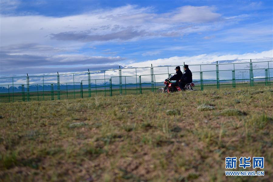 在可可西里索南達(dá)杰保護(hù)站,龍周才加(右)與隊(duì)友才仁多杰騎摩托巡查藏羚羊救護(hù)基地(6月29日攝)。新華社記者 張龍 攝