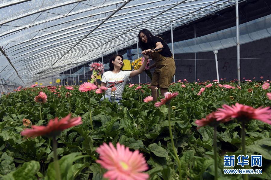 7月10日,在莒縣招賢鎮(zhèn)西黃埠村盛世花卉種植專業(yè)合作社,駐村第一書記鐘翠娟(左)在扶郎花種植大棚進行網(wǎng)上直播。山東省日照市莒縣招賢鎮(zhèn)有20余年的玫瑰花、扶郎花種植歷史。目前,招賢鎮(zhèn)投資建設(shè)的高標準特色鮮花種植大棚可年產(chǎn)700-800萬枝優(yōu)質(zhì)玫瑰和扶郎花等,帶動周邊鄉(xiāng)鎮(zhèn)的建檔立卡貧困戶脫貧增收。新華社記者 范長國 攝