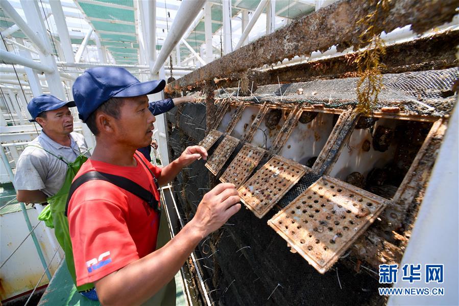 7月14日,在福建省連江縣深遠(yuǎn)海養(yǎng)殖平臺(tái)“福鮑一號(hào)”上,工人在查看鮑魚長(zhǎng)勢(shì)。新華社記者 姜克紅 攝