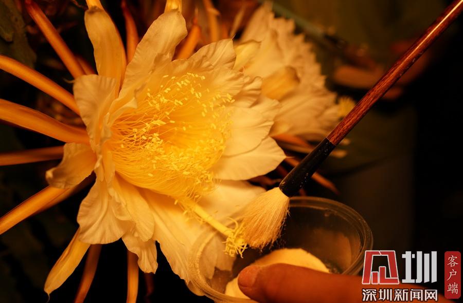 2020年7月14日晚,在廣西融水苗族自治縣融水鎮(zhèn)三合村黎鄧屯,兩名村民正在給紅心火龍果“點花”。
