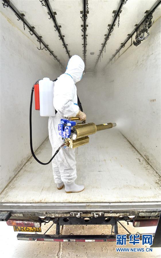 7月15日,北京二商肉類(lèi)食品集團(tuán)有限公司員工對(duì)冷鏈運(yùn)輸設(shè)備進(jìn)行消毒。北京二商肉類(lèi)食品集團(tuán)有限公司是保障北京肉類(lèi)市場(chǎng)供應(yīng)的主要企業(yè)之一。新冠肺炎疫情以來(lái),企業(yè)嚴(yán)格實(shí)施北京市、農(nóng)業(yè)農(nóng)村部和中國(guó)肉類(lèi)協(xié)會(huì)的防疫要求,對(duì)進(jìn)入廠(chǎng)區(qū)的人員、車(chē)輛以及原料采購(gòu)、屠宰分割、產(chǎn)品加工、貯藏運(yùn)輸、廢棄物收集及污水處理等生產(chǎn)環(huán)節(jié)嚴(yán)格防疫,強(qiáng)調(diào)源頭把關(guān)徹底消毒。目前,集團(tuán)公司下屬多家生豬屠宰加工基地正常運(yùn)營(yíng),保質(zhì)保量供應(yīng)北京市場(chǎng)需求。新華社記者 李欣 攝