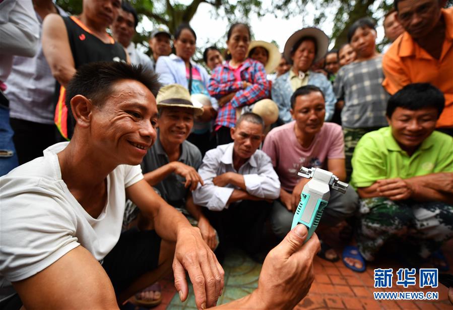 7月15日,瓊中縣什運(yùn)鄉(xiāng)便文村村民在了解電動割膠刀的構(gòu)造。當(dāng)日,海南瓊中黎族苗族自治縣什運(yùn)鄉(xiāng)為542名貧困戶免費(fèi)發(fā)放電動割膠刀,割膠刀研發(fā)單位為貧困戶提供使用技能培訓(xùn)。海南有著豐富的天然橡膠資源,但傳統(tǒng)膠刀的割膠技術(shù)要求高,農(nóng)民難以掌握,許多膠林閑置。電動割膠刀使割膠簡單易學(xué),幫助村民提高割膠效率,助力脫貧增收。新華社記者郭程攝