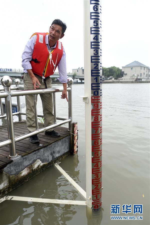 7月17日,王江涇水文站工作人員介紹京杭大運河水位情況。浙江省嘉興市秀洲區(qū)處在杭嘉湖平原,受持續(xù)強降雨及上游排水影響,近期,秀洲區(qū)境內(nèi)的京杭大運河分支航道持續(xù)保持較高水位。當?shù)叵嚓P(guān)部門嚴陣以待,落實各項措施,確保安全度汛。新華社記者韓傳號攝