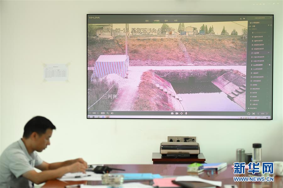 7月17日,在岳陽市華容縣治河渡鎮(zhèn)防汛抗旱指揮所,大屏實時顯示新華垸三門閘附近情況。為力爭安全度汛,湖南省岳陽市華容縣織密人防、物防、技防“三防”網(wǎng)絡,加強應急值守和巡查排險工作,采取“以船代倉”“以車代倉”等多種方式靈活儲備防汛物資,在險工險段布置攝像頭實時監(jiān)控,利用無人機對人員難以到達的位置進行巡查。新華社記者陳澤國攝