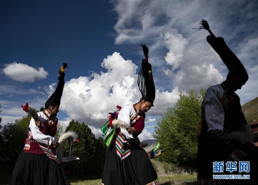 尼瑪(中)和弟子們正在表演“久河卓舞”(7月1日攝)。新華社記者普布扎西攝