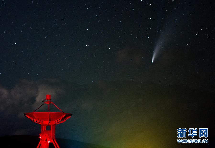 7月18日晚,在明安圖觀測基地,尼歐懷茲彗星劃過天際。7月18日晚至19日凌晨,在位于內蒙古錫林郭勒盟正鑲白旗境內的國家天文臺明安圖觀測基地,尼歐懷茲彗星劃過天際。在明安圖觀測基地內,排列著100面白色的拋物面天線。這個龐大的天線陣列便是草原“天眼”——明安圖射電頻譜日像儀。草原“天眼”持續(xù)接收太陽射電輻射,然后由科研人員進行數(shù)據分析研究,對空間環(huán)境監(jiān)測、太陽活動預報均有重要作用。新華社記者連振攝