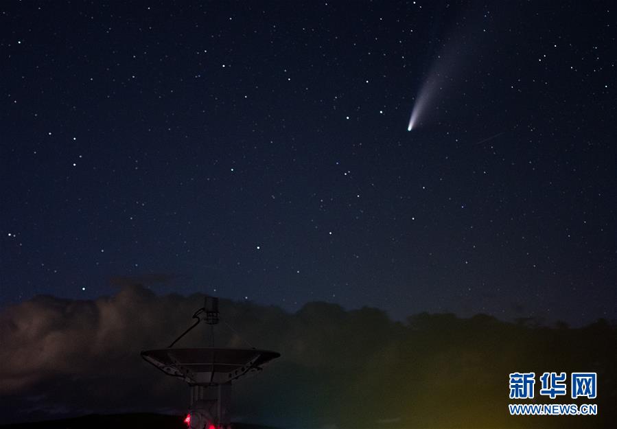 7月18日晚,在明安圖觀測(cè)基地,尼歐懷茲彗星劃過(guò)天際。7月18日晚至19日凌晨,在位于內(nèi)蒙古錫林郭勒盟正鑲白旗境內(nèi)的國(guó)家天文臺(tái)明安圖觀測(cè)基地,尼歐懷茲彗星劃過(guò)天際。在明安圖觀測(cè)基地內(nèi),排列著100面白色的拋物面天線。這個(gè)龐大的天線陣列便是草原“天眼”——明安圖射電頻譜日像儀。草原“天眼”持續(xù)接收太陽(yáng)射電輻射,然后由科研人員進(jìn)行數(shù)據(jù)分析研究,對(duì)空間環(huán)境監(jiān)測(cè)、太陽(yáng)活動(dòng)預(yù)報(bào)均有重要作用。新華社記者連振攝