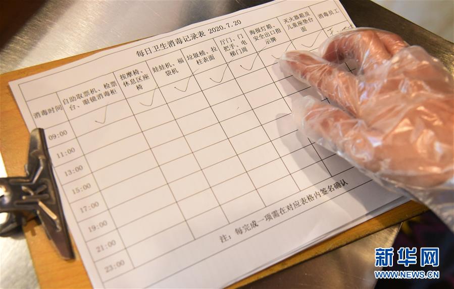 7月20日,濟南新世紀電影城陽光100店的員工在展示消殺記錄。當日,山東濟南市部分電影院在嚴格防控疫情的基礎(chǔ)上陸續(xù)恢復開放。新華社記者王凱攝