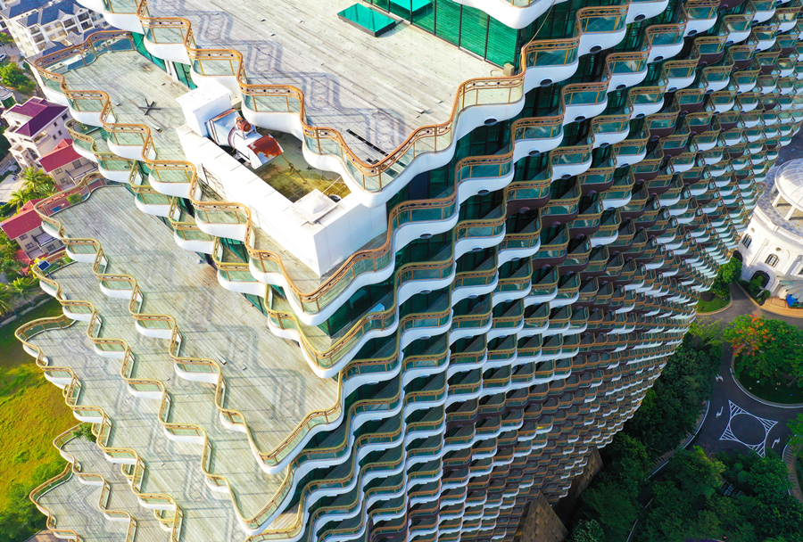 2020年7月20日,海南省三亞市,圖為航拍的“九棵大樹”建筑群。建筑物陽臺均為波浪形,視野良好,契合三亞“?!钡膶傩?。