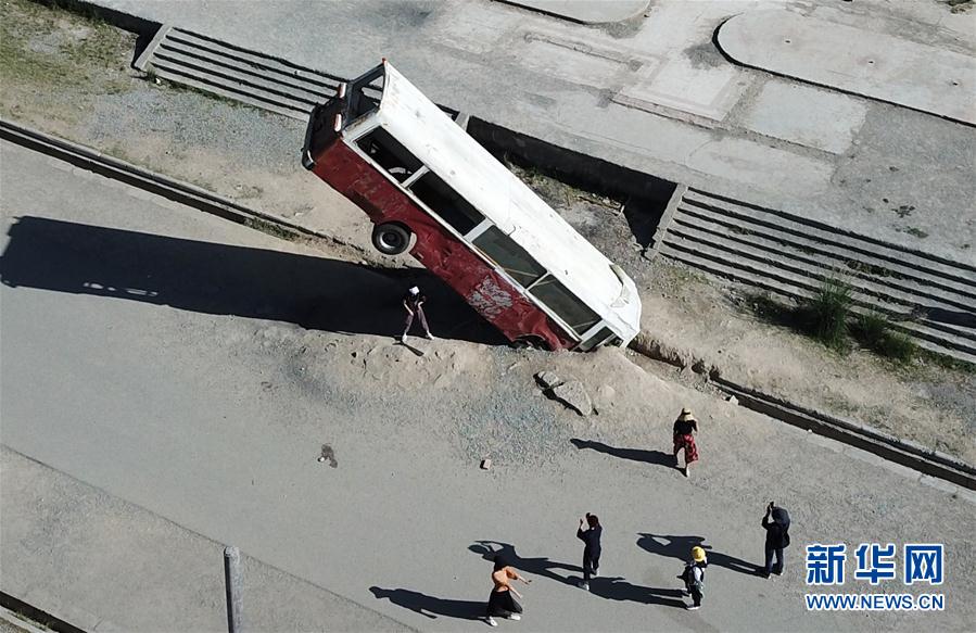 2019年8月23日,游客在阿克塞老縣城一處因拍攝電影而設(shè)置的景觀(guān)前拍照(無(wú)人機(jī)照片)。