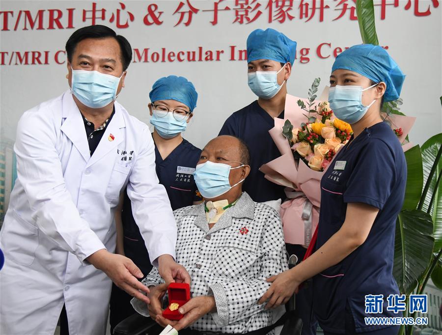 7月21日,武漢大學(xué)人民醫(yī)院醫(yī)護人員護送崔先生出院。新華社記者程敏攝